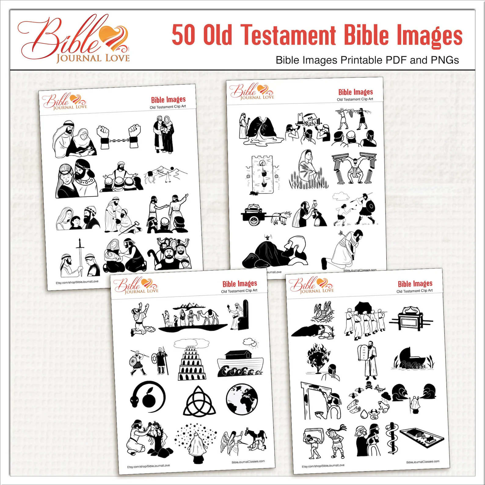 This set includes 50 Old Testament Bible clipart images in both PDF and PNG format—perfect for Bible journaling, lesson illustrations, or even uploading into Logos Bible Software as visual bookmarks and notes.