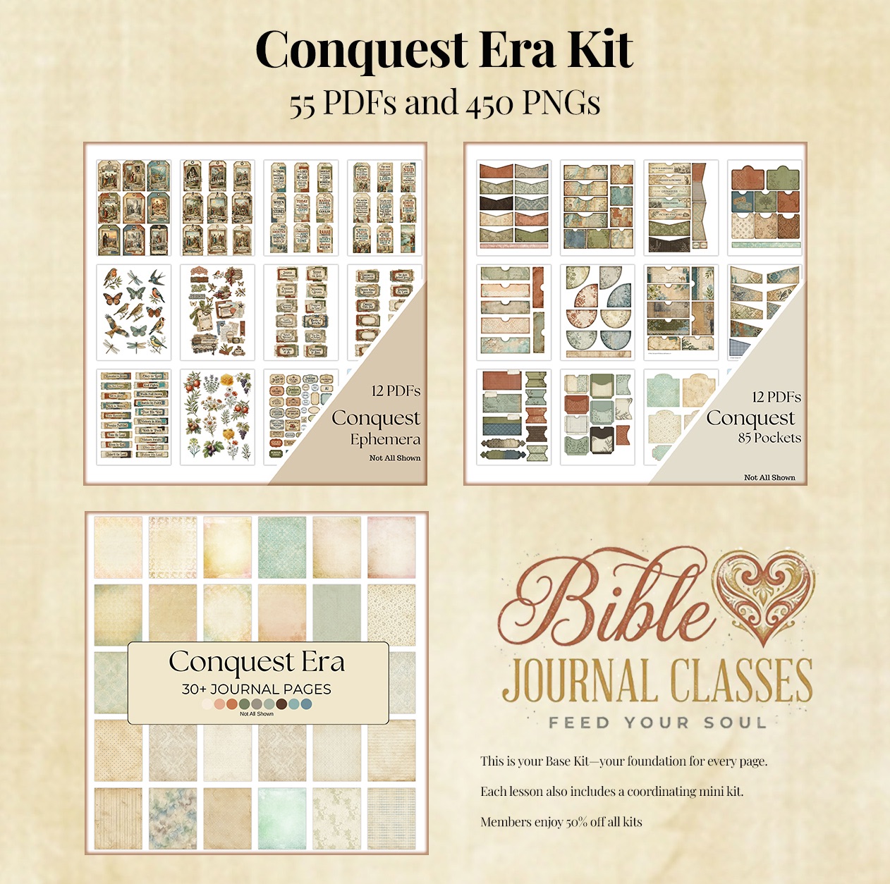This beautifully designed base kit is filled with layered clusters, teaching infographics, pockets, tags, and vintage junk journal elements that bring the lesson to life on your page.Â